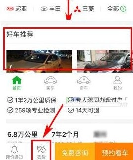 1. 开启瓜子二手车应用,于首页挑选自己心仪的车辆,随后在车源详情页面点击下方的【砍价】按钮。(具体位置可参考下图)