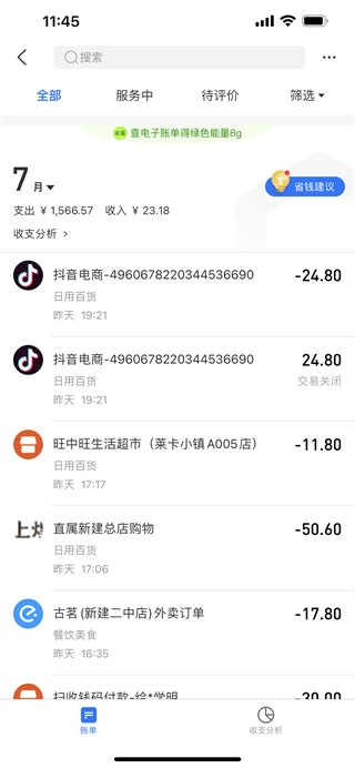 2、点击账单功能后,先找到需删除的交易记录,接着向左滑动该页面。