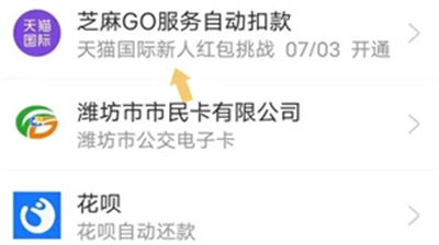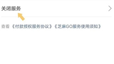 就拿“芝麻GO服务自动扣款”来说,点击“芝麻GO服务自动扣款”这一选项,在弹出的界面中找寻关闭服务的入口。具体如以下图示: