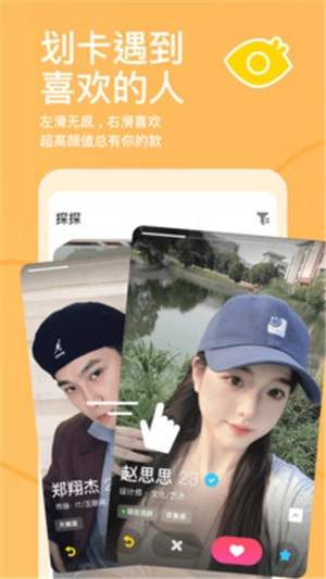 探探会依据你当下所处位置、地理距离以及性别偏好,实时为你推送周边有意思的人。你要做的超简单,只需滑滑滑!向右滑表示喜欢,向左滑代表无感。