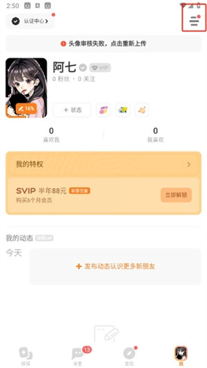2、接着在我的页面里,我们要点击的是右上角的【三横图标】。