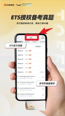 3、进入“听力”模块,你能够练习ETS真题。这里题目分类清晰明了,不仅有详细解析,还支持重复练习,定能助你提升效率,达到事半功倍的效果。