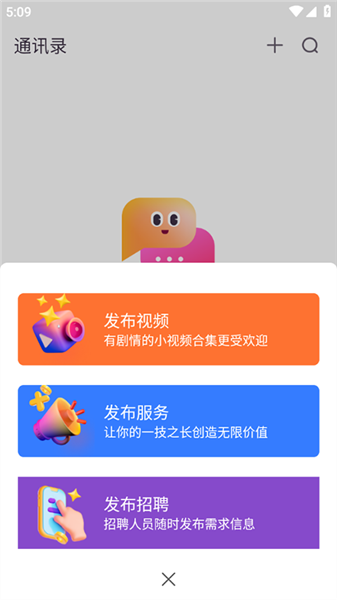 3、点击下方栏目里的“+”,可一键发布视频、招聘信息以及服务内容等。