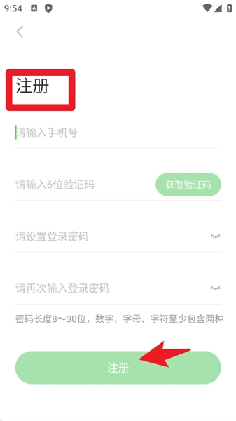 1. 开启App后,轻点页面左上方的“注册”按键,填入手机号、验证码以及密码,从而完成账号的注册。