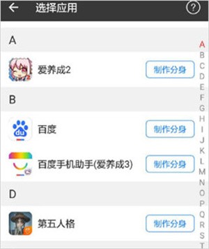 2、点击加号后,手机中安装的软件会显示出来,通过点击字母来选择软件,进而制作相应的分身。