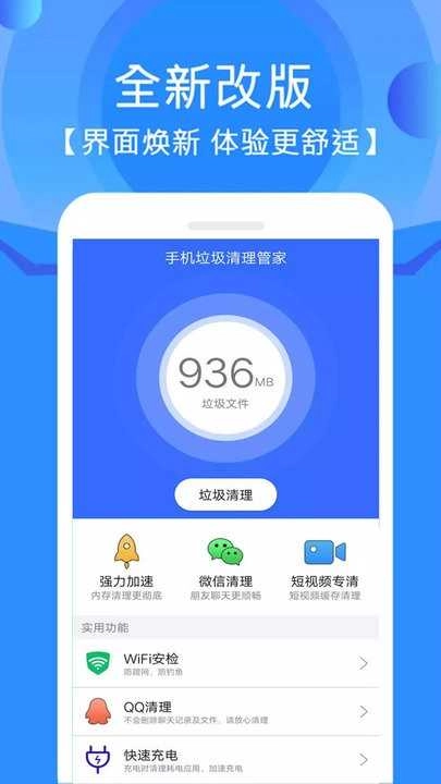 1、进入软件,即可发现一系列实用功能,包括强力加速、微信清理、短视频专清、图片清理、大文件管理、QQ清理、快速充电、wifi测速等。