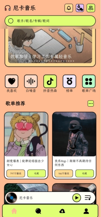 点开尼卡音乐,便能瞧见我喜欢、白噪音、抖音热曲、榜单、歌单广场等板块。