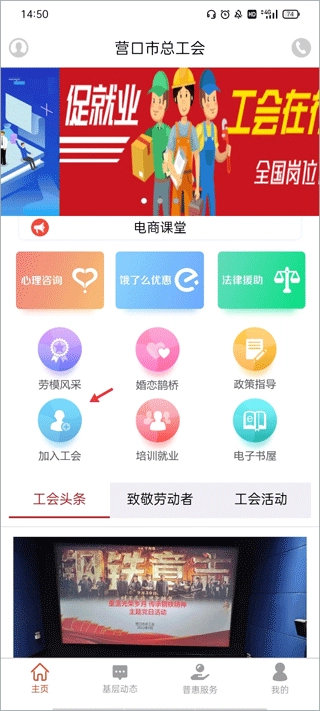 1. 开启营口工会应用程序,进入其主页,然后点击页面上方的“加入工会”功能选项。