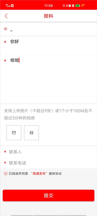 2. 进入界面,填写报料标题、内容、相关图片以及联系人等信息,随后点击“提交”就行。