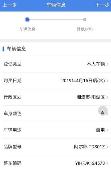 3、轻点“我要上牌”,随即进入“车辆信息”页面。在此页面录入车辆相关信息后,点击“下一步”,便可进入“其他材料”页面。接着开始上传诸如“车辆照片”“来历证明”“合格证”等图片,上传完毕后,再次点击“下一步”,进入“领牌方式”页面,选择“现场申领”就完成该步骤操作了。