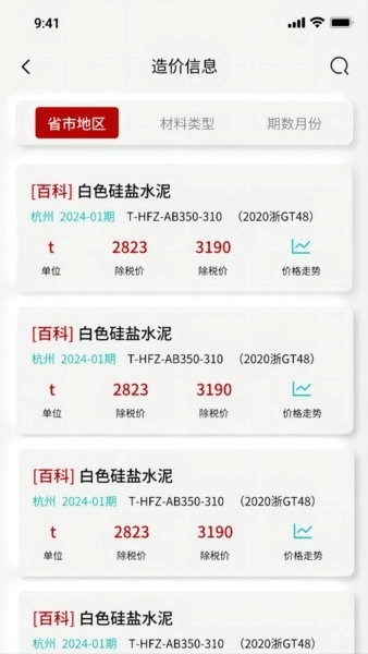 能够实时查阅各地最新的材料信息价格,若点击价格走势板块,便能够查看材料的历史价格波动情况。