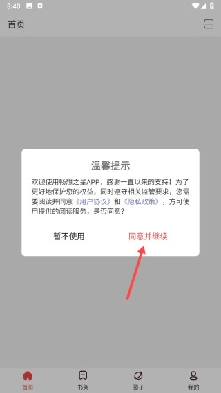 1. 当本页面操作完成后,打开畅想之星,届时系统会弹出用户协议及隐私政策提示。您只需点击【同意并继续】,就能进入主页面,随即准备进行登录操作。
