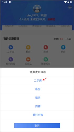 2、选择你要发布房源的类型,像租房、新房等,选好后点击进入。