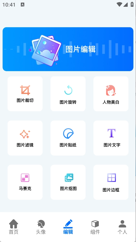 3、在编辑页面中提供图片载切、图片旋转、人物美白、图片滤镜、图片贴纸、图片文字等等功能;