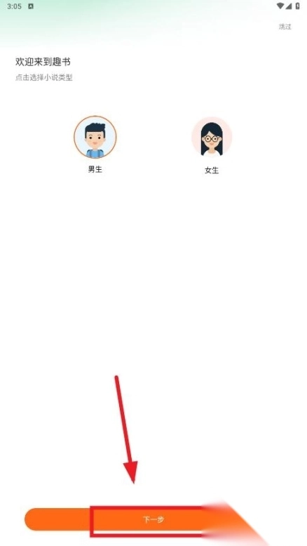 打开趣书小说应用后,先点击同意相关协议,接着选择自己的性别,再点击下一步按钮。