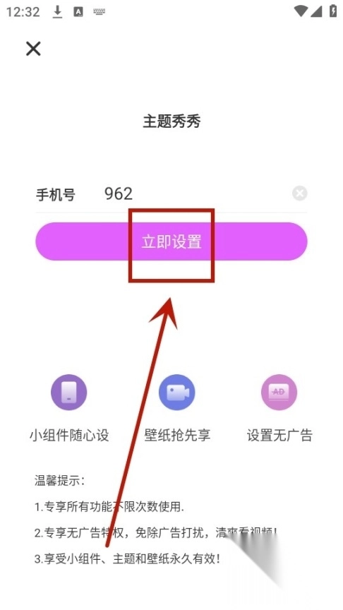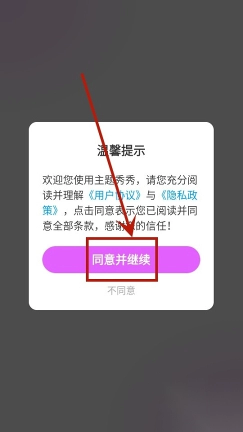 先把主题秀秀这个应用安装好并启动,接着在弹出的界面里找到相关选项,点击同意服务条款并进入下一步操作,同时确认接受对应的隐私规则。