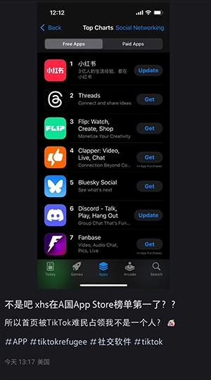 由于TikTok在美国面临封禁风险,大量当地用户转而涌向小红书平台,这一用户迁移现象直接推动小红书登上了美国App Store应用商店的榜首位置。