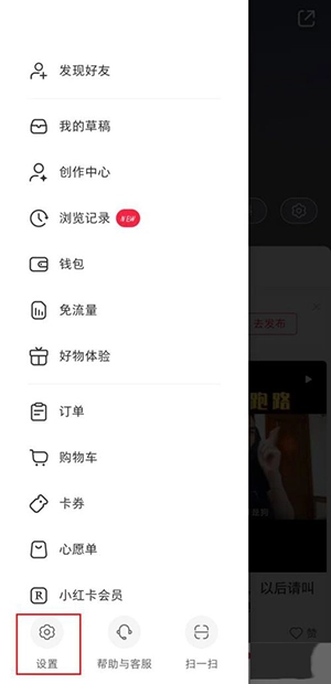 打开小红书应用,进入后点击底部导航栏的【我】选项,接着点击页面左上角的三横线图标,最后在弹出的菜单中选择【设置】。