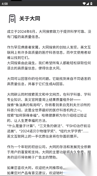 大同搜索(datong.info)专注于提供科学可靠的高质量中文信息服务,现阶段已上线跨语言搜索与AI回答功能,仅三个月用户规模便实现了十倍增长。大同始终致力于推动“语言大同”——借助跨语言搜索能力,将全球优质信息进行翻译整合,助力打破不同语言间的沟通壁垒;实现“认知大同”——依托通俗易懂的AI回答形式,让缺乏专业知识背景的人群也能轻松理解各类科学概念,消除认知层面的障碍;达成“信息大同”——AI搜索的最终目标,是让科学可靠的信息触达每一个人,不再有获取门槛。