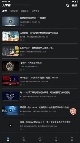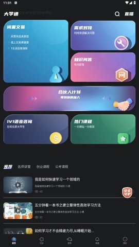 大学通具备限制交易、知识问答、创业合伙人、在线咨询等服务功能,同时还提供名师讲堂、公考、创业等相关的视频及直播课程。