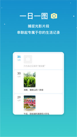 一日一图功能鼓励用户捕捉光影瞬间并记录下来,以此串联起独属于自己的生活故事。用户能够通过拍摄新图片或从相册中选择已有图片,记录下日常生活里的点滴细节,借助图像形式展现个人的生活轨迹,让每一天都拥有独特的视觉记忆留存。