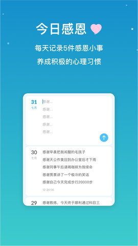 通过日复一日的记录与坚持,用户能慢慢察觉到自身心理状态的细微转变,进而更有效地疗愈当下的自己,勾勒出更积极向上的未来图景。小治愈软件倡导用户每日记录并思索生活里值得感恩的五件小事,借助这样的记录,用户得以培育感恩的心境,增强自身的幸福感与满足感。