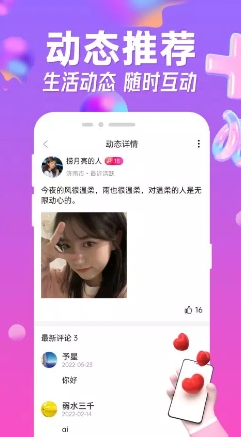 动态推荐功能支持用户随时查看其他网友的最新动态,用户可就这些生活动态实时互动,也能自由发表评论。