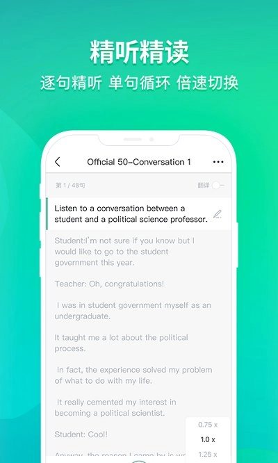 海量核心资料精听精读,支持多种倍速切换,支持单句循环播放,帮你快速提升听力能力;
