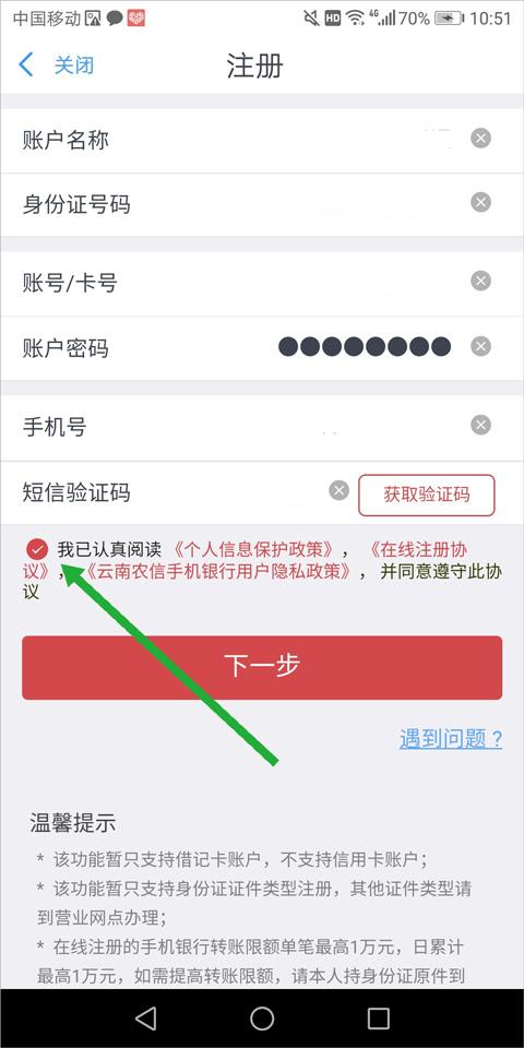 请按以下步骤操作:首先依次准确填写开户时使用的姓名、身份证号、开户账号、开户密码以及预留手机号;接着点击【获取验证码】按钮获取验证码并填入对应位置;随后勾选同意相关政策协议(即下图中绿色箭头指向的区域);最后点击【下一步】按钮。