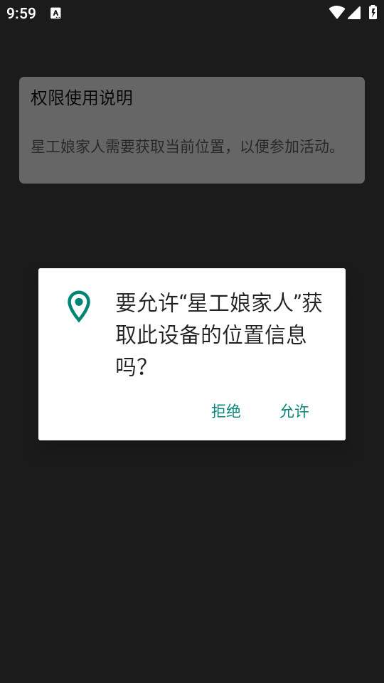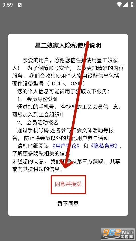 请先安装“星工娘家人”应用,安装完成后打开它,在出现的相关提示界面中点击“同意并接受”按钮。