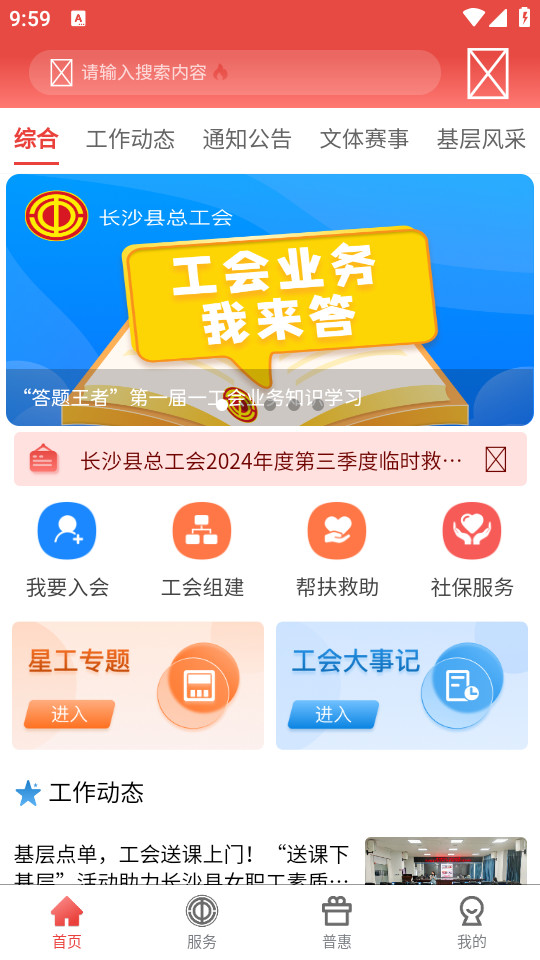 这款移动客户端功能全面、界面简洁且操作便捷,为长沙县总工会的职工带来了高效、贴心的服务体验。职工能够通过它浏览技能培训的相关信息,报名参与培训课程,从而提升自身的技能素养;也可以及时获取技能竞赛的动态,并完成报名流程。平台还提供了丰富的资讯内容,涵盖工作动态、工会新闻等板块,方便职工了解最新资讯。另外,职工还能在客户端上查看求职招聘信息,寻找适配的岗位机会。通过平台开展的各类普惠活动,职工可以便捷地知晓品牌优惠详情,并快速参与其中。