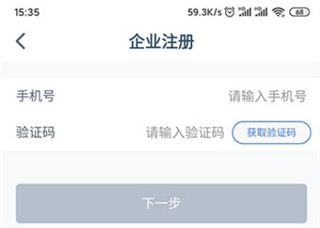 企业办理注册手续时,需先输入手机号码并填写验证码,随后点击“下一步”按钮。
