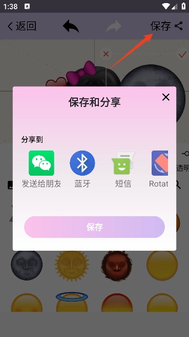 制作完成后,点击右上角的保存按钮,就能把自己制作的表情保存下来,还能分享到微信等第三方平台使用哦!