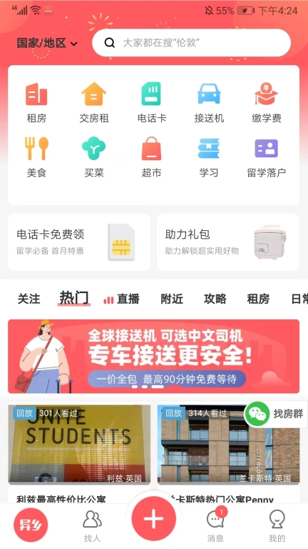 打开异乡应用进入主界面后,能看到首页、找人、发布、消息和我的这几个频道。在当前显示的首页界面里,涵盖了租房、交房租、接送机、缴学费、学习、美食等多种功能选项,用户可以依据自身需求挑选使用。