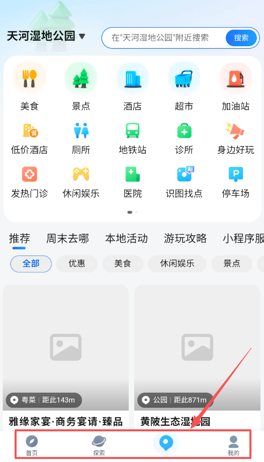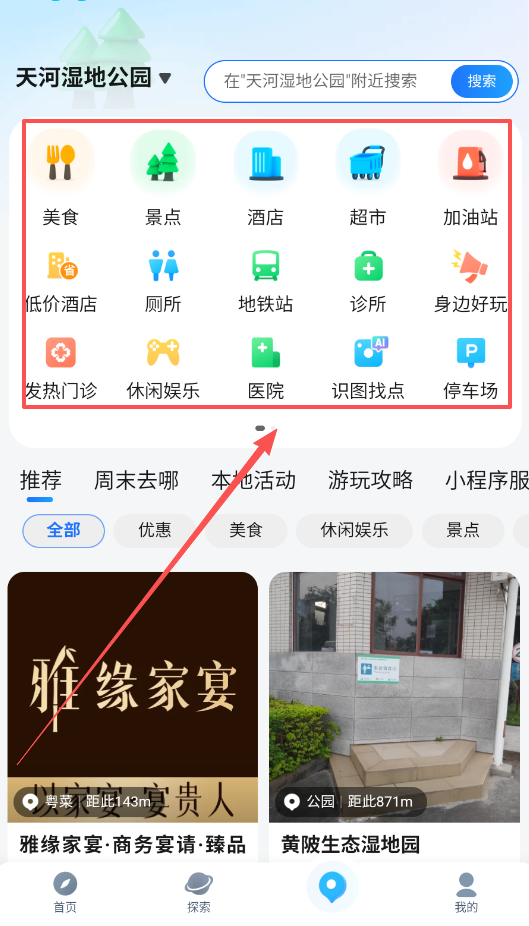 探索周边:能够发现附近适合吃喝玩乐的好地方,选择周边选项就能带你游览这些好去处。