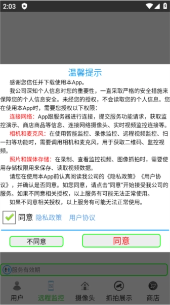 首先需要您同意隐私条款,并授予拨打电话和管理通话(用于读取设备ID作为监控ID)、相机、麦克风的权限(用于视频监控),之后就能在屏幕顶部看到您的手机监控ID,以及包含本机监控ID的二维码。