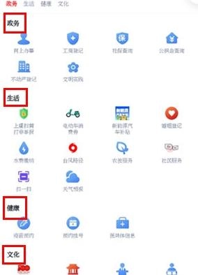 在服务界面,可依据政务、生活、健康、文化这四个分类查找相关服务。