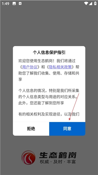 打开生态鹤岗应用,先阅读个人信息保护指引,阅读完毕后点击同意按钮,进入首页即可看到推荐直播、短视频等栏目。