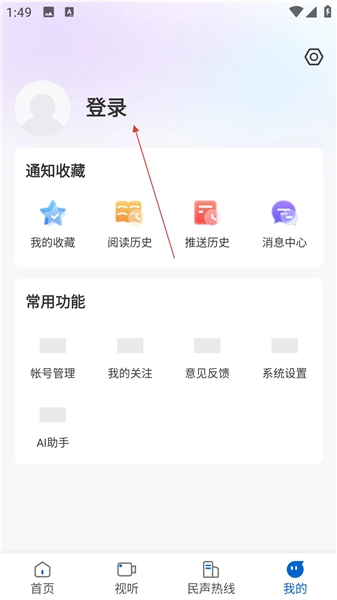 个人中心集成了我的收藏阅读、历史推送、历史消息中心等功能板块,点击登录按钮即可执行账号登录操作。
