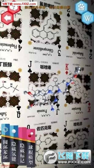 “AR分子浏览器”是“拟观药”的核心应用场景。用户只需打开“AR分子浏览器”,无论是扫描药物学习辅助纸牌正面的分子结构式,还是背面的“药维码”,都能在手机上看到酷炫的3D药物分子模型。若在屏幕范围内移动纸牌,3D药物分子模型会随之移动、旋转、缩放,用户甚至可以把碳原子和碳键换成自己喜欢的颜色。