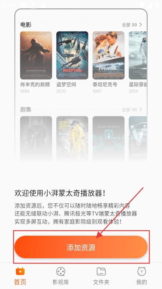 进入小湃蒙太奇播放器的首页,能看到电影和剧集推荐,点击【添加资源】按钮,就可以添加本地或者网盘等存储资源,从而畅享更多内容。