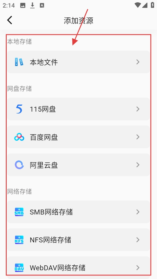 进入添加资源页面后,会看到本地存储、网盘存储、网络存储等不同分类选项,你可以选择对应的存储方式,比如【百度网盘】,然后添加影视资源。