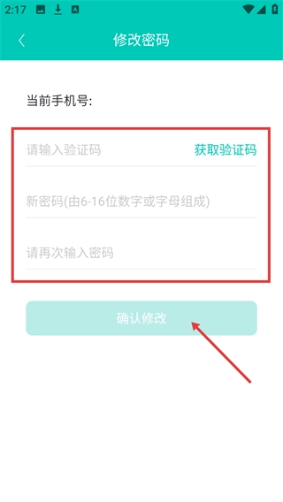 进入【修改密码】页面后,首先点击【获取验证码】按钮,待收到验证码并填写完毕,再输入新密码,最后点击【确认修改】按钮,即可完成密码修改流程。