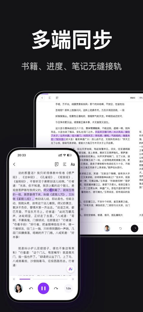 你可以上传并收听PDF、EPUB、TXT、AZW、MOBI等任意文档格式,无需担心格式转换问题,也不受格式限制。