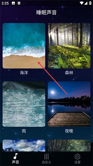 在自定义页面中,点击【风】音效卡片,该音效归属于自然类别,能够和当前正在使用的【海洋】音效进行组合播放。