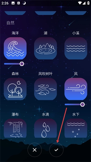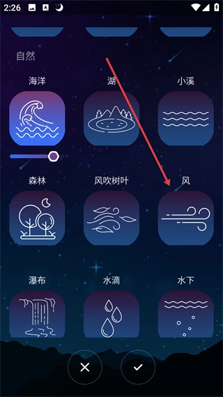 选好音效后,拖动滑块能调节【风】音效的音量,调整好后点击对勾按钮确认自定义设置。