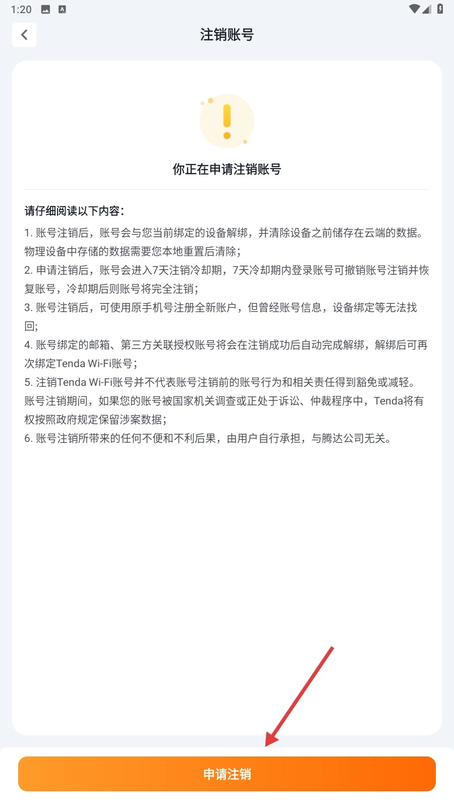 进入账号注销页面,认真阅读完账号注销的相关说明后,点击页面底部的【申请注销】按钮,就能提交账号注销的申请了。