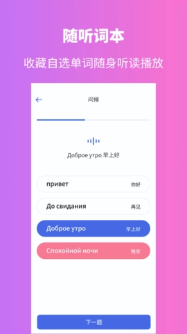 这款俄语学习应用功能丰富,是小语种学习的得力助手。它整合了俄语各场景对话内容,每个单词和对话都配有标准真人发音,还同步提供俄语字母、罗马音标注及中文翻译,为入门学习者筑牢基础。作为便携的随身工具,它让俄语学习更轻松。除了多元学习场景,应用内还有高清俄语教学视频与翻译功能,助力用户从零基础逐步精通。无论是旅游、金融法律场景,还是表达态度情感,用户都能在学习中感受趣味,轻松掌握俄语。
