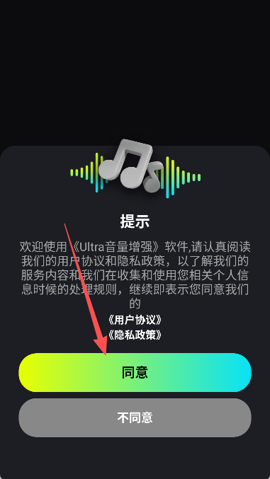 在手机上打开软件,在提升窗口中点击“同意”按钮。