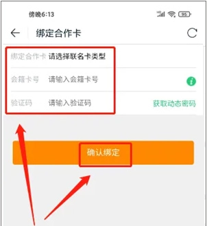 在合作卡绑定页面选择联名卡类型,填写会籍卡号与验证码后,点击【确认绑定】按钮。